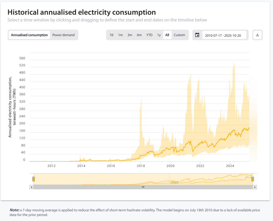 The Cambridge Centre for Alternative Finance has regularly published statistics on the electricity usage of cryptocurrency mining. Their reports underscore the major energy demands of mining, particularly for Bitcoin, which relies on an energy-intensive proof-of-work mechanism. The Centre has had to update their methodologies and revise downwards past estimates of electricity usage. The range of theoretical lower and upper bounds means these estimates are just that, but they reveal an upward trend.